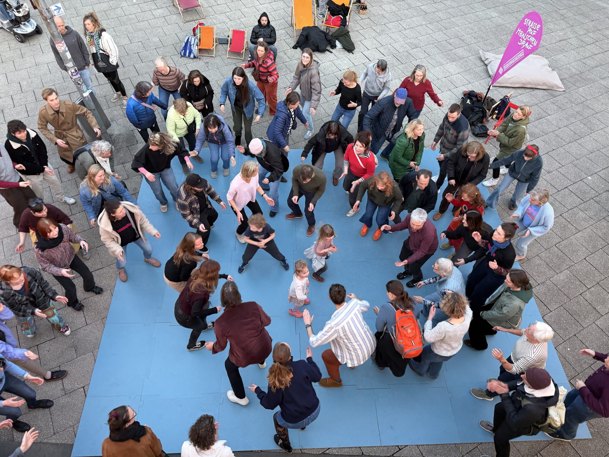 Erst einzeln, dann in Gruppen – Menschen, die bewusst den Weg zum Ebertplatz gefunden hatten, und solche, die einfach vorbeikamen und blieben. DJ JazzMedic sorgte für den Sound, der Platz füllte sich, und was zunächst als Zuschauen begann, wurde nach und nach zum Mitmachen.