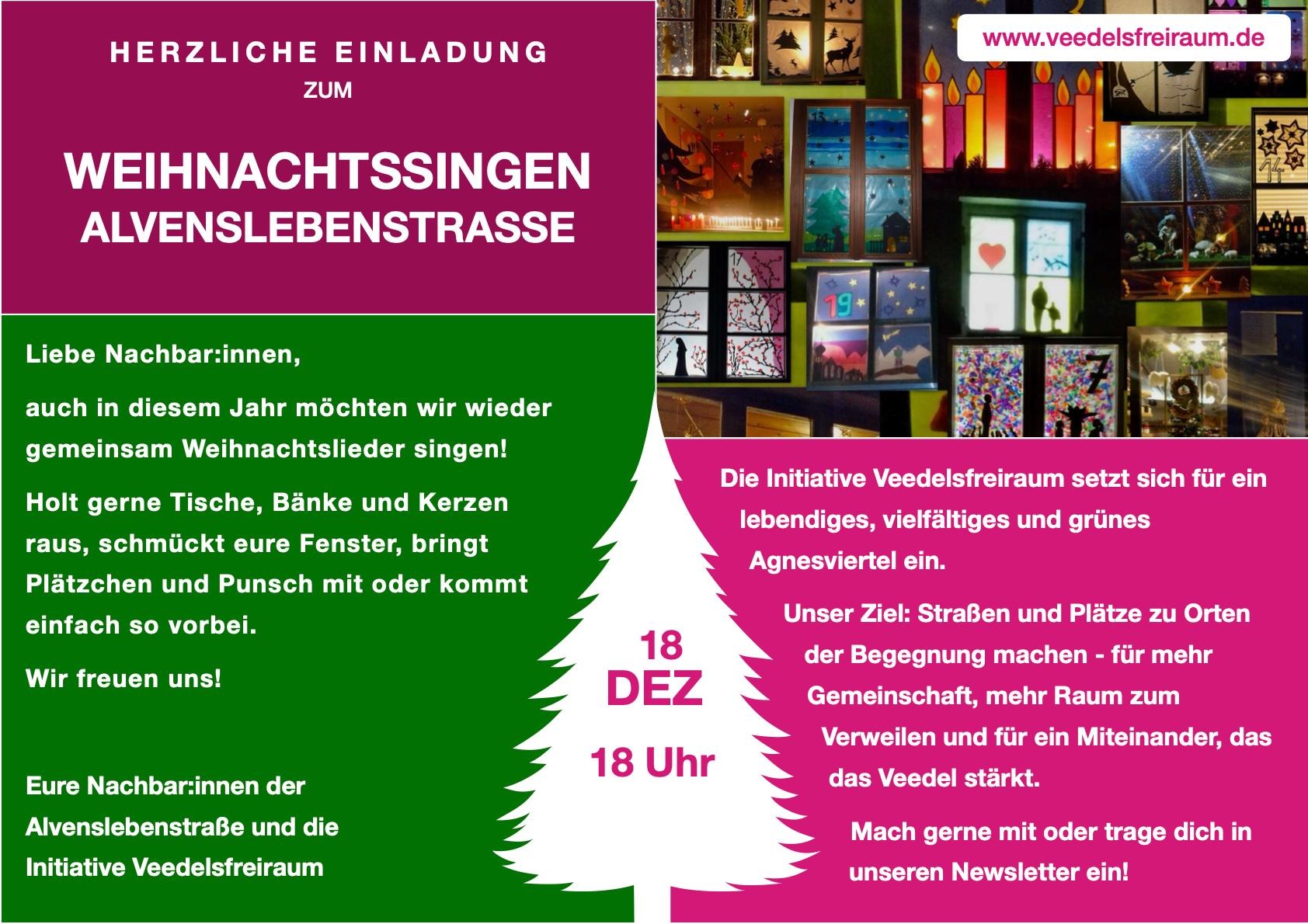 Datum & Uhrzeit: 📅 Donnerstag, 18. Dezember 2025 🕕 Beginn: 18:00 Uhr Ort: 📍 Alvenslebenstraße, 50668 Köln (Agnesviertel) Beschreibung: Auch dieses Jahr laden die Nachbar:innen der Alvenslebenstraße und die Initiative …